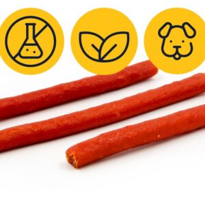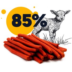 Naturalne, mięsne kabanosy z delikatnej jagnięciny – idealne jako codzienna nagroda lub przekąska dla psów w każdym wieku.